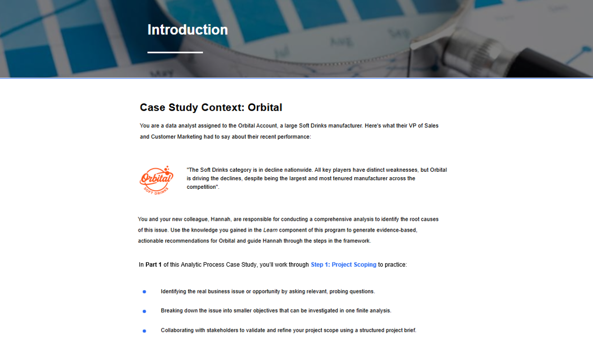 For case study design in Learn, I collaborated with SMEs to update an existing data story and reports to incorporate the changes we’d aligned on in the analysis phase to improve the learner experience. The Practice case study design was a bit more complex; I put together a report series focused on a new business challenge, working closely with SMEs to ensure accuracy and alignment of the data to the narrative I created for learners to practice applying their analytic process skills in a real-world context.