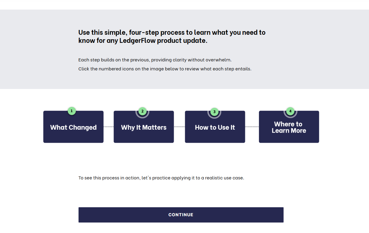 LedgerFlow, a fictional financial operations platform, releases frequent product updates that directly affect users’ month‑end workflows. I designed an eLearning module that introduces a four‑step framework for learning any update quickly and confidently. The experience uses realistic scenarios, guided exploration, and targeted assessments to help users interpret changes, understand workflow impact, and locate the right resources at the right time.